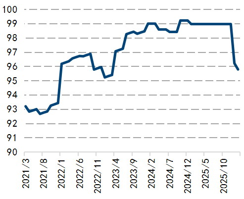 图为中东地区电解铝产能月度开工率(%)