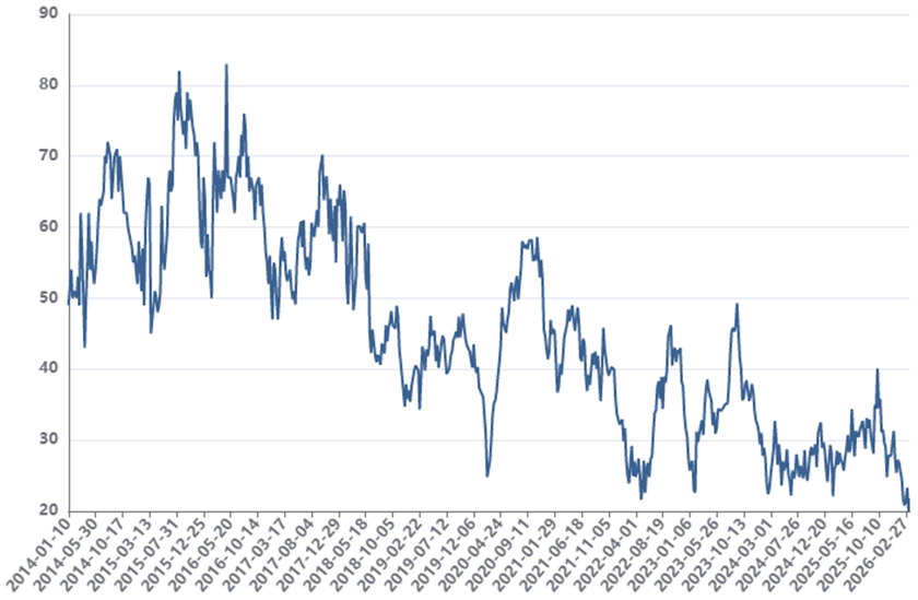沥青基本面好转直接体现在库存变化上。随着去年年末和今年年初地炼释放冬季储备,叠加春节假期期间需求停滞,国内沥青社会库存持续攀升,整体库存压力处于近三年来中等偏上水平。从沥青社会库存的季节性规律来看,每年1—3月是季节性累库阶段,4—6月库存攀升至年内高位,7月后随着国内进入需求旺季,库存开始持续下滑。当前正处于沥青累库周期末尾,库存增量有限。