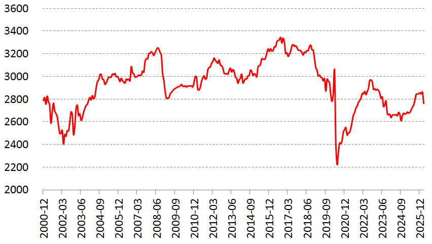 其次,高油价导致市场预期美联储将暂停货币政策宽松步伐,甚至可能在明年转向紧缩。在3月议息会议上,美联储“按兵不动”。会后公布的利率点阵图显示,2026年只有1次25个基点的降息,甚至有一位官员预计明年加息1次。美联储将今明两年通胀(核心PCE增速)预期分别上调至2.7%和2.2%,去年12月的预测分别为2.5%和2.1%。对多数资产而言,实际利率上升必然会增加持有成本。截至3月23日,衡量美元实际利率的10年期通胀保值国债(TIPS)收益率突破2%,创2025年7月21日以来最高。