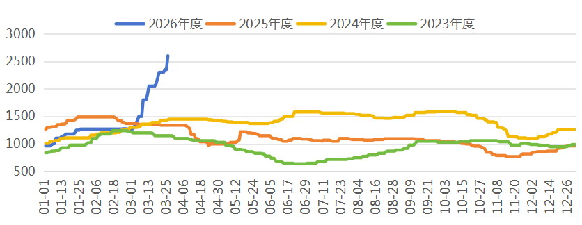 本轮合成橡胶的强势上涨,核心驱动力来自成本端丁二烯价格的大幅攀升,中东冲突持续是引爆整条产业链的导火索。受中东局势紧张影响,国际油气价格大涨,亚洲炼厂负荷逐步下降,丁二烯供应出现明显缺口。据隆众资讯数据,截至3月26日,国际丁二烯(CFR中国)市场价飙升至2600美元/吨,较3月初的1275美元/吨上涨1.04倍。