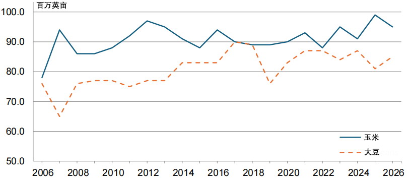 图为美国玉米和大豆种植面积(2026年为意向种植面积)