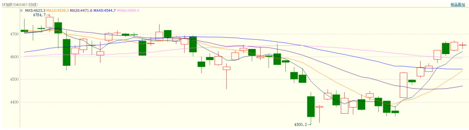 IF加权在连续上涨后收小十字星,既没有延续强势再创阶段新高,也没有出现破位下跌的空头反转信号,处于多头趋势中的蓄力消化阶段。K线在所有均线上方,沿着5日均线上行,成为短期多头的关键防线。MACD保持金叉状态,红柱实体持稳,依然维持多头格局。近期,成交量小幅增长,持仓量维持低位,表明价格进入压力区间后,市场主动追高意愿不坚决。综合来看,IF仍处于上升趋势中,建议维持多头思路。
