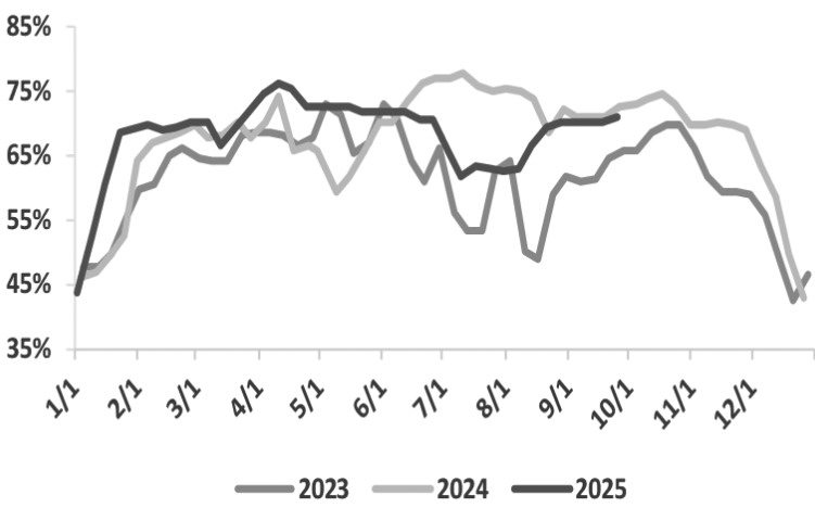 煤制甲醇利润虽维持高位,但秋检前置效应不容忽视,需关注明显亏损状态下国内气头装置限气停车的时间节点。在装置良好的背景下,伊朗进口甲醇维持高位,但产量已有下滑迹象,需关注伊朗装置是否提前限气停车。传统下游“银十”需求仍可期待,重点关注MTO、醋酸、MTBE装置四季度密集投产及冬季燃料需求对甲醇消费的拉动,但下游整体经济性偏弱仍制约企业开工积极性。