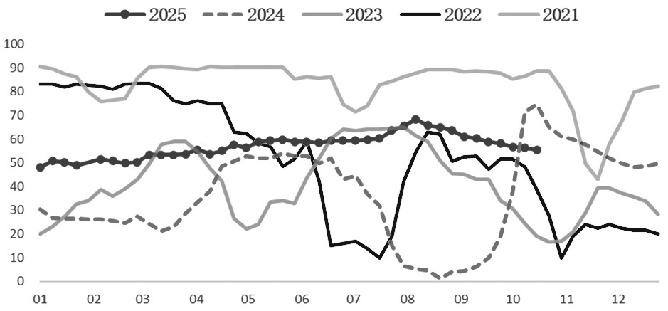 图为钢联247家钢厂中盈利占比(单位:%)