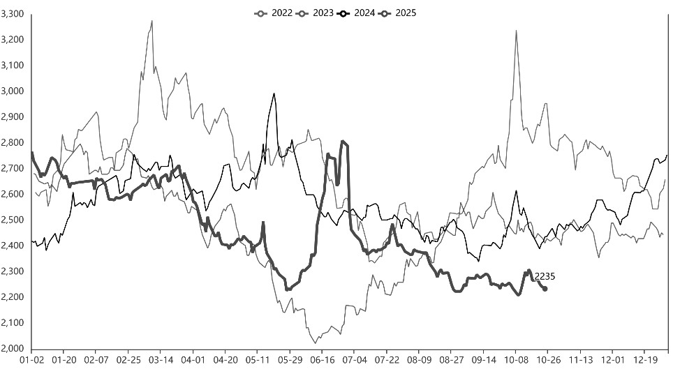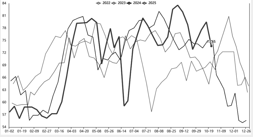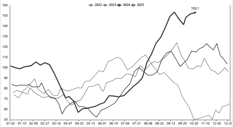 港口库存持续大幅累积是压制甲醇价格的核心因素。据统计,截至10月23日,沿海主要地区甲醇港口库存合计为153.1万吨,处在历史最高位,较去年同期增加约38万吨。高库存不仅反映了供需错配的现状,而且对现货价格产生直接压制。据不完全统计,未来两周,甲醇进口船货到港量约为98万吨,该数值比往年均值高了约50%。这意味着港口库存压力短期将继续加剧。