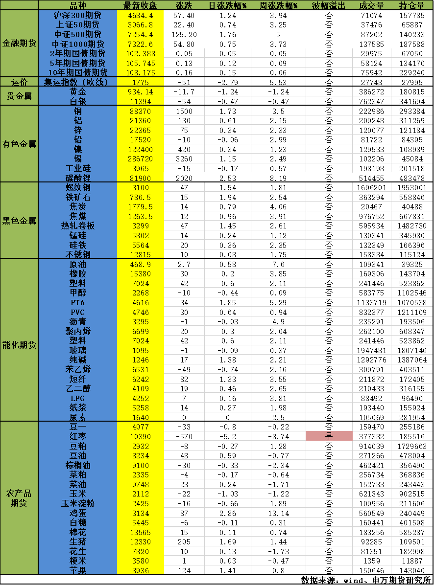 贵金属:金银高位回调。以俄乌为代表的地缘政治风险有所降温。最新一轮中美会谈就解决各自关切的安排达成基本共识,双方同意进一步确定具体细节,并履行各自国内批准程序。美联储主席暗示暂停缩表,低于预期的9月通胀数据后,市场对年内两次降息的计价已较为充分。美国政府“停摆”仍在持续发酵,市场缺乏更多经济数据的指引。白银现货端的挤兑有所缓解。大环境层面,在美国财政赤字、债务状况持续恶化,全球对抗加剧,对当前金融体系不信任度上升背景下,各国央行持续增持黄金,投资者对黄金避险、价值储藏的认可度不断升温,黄金成为最终极安全资产的长期叙事主导愈发明显,加剧上涨速度和强度。但是快速上涨后累计了一定盈利仓位,在驱动因素有所弱化下,在价格高位后出现持续调整。