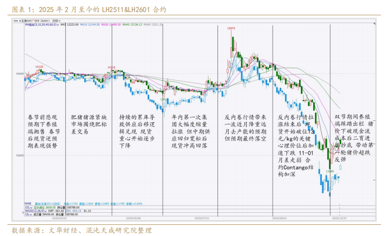 今年一二季度,生猪期货震荡阴跌,盘面的交易重心按时序来说有二:一是春节后猪价淡季坚挺带来的预期差,二是利润尚存下养殖端持续逆势累库带来的供应后移逻辑。进入三季度,交易顺序是从宏观利好到基本面利空:先是7月23日农业部召集头部猪企开会讨论降重及去产能,盘面迎来千点上涨。但情绪退潮后,降重和去化均未能兑现,高供应迅速压制超涨的现货。进入四季度后盈亏拐点正式来临,双节期间养殖端恐慌性抛售,节后盘面估值下杀至历史新低。10月中下旬,二育大量进场抄底,猪价在投机需求支撑下超跌反弹。