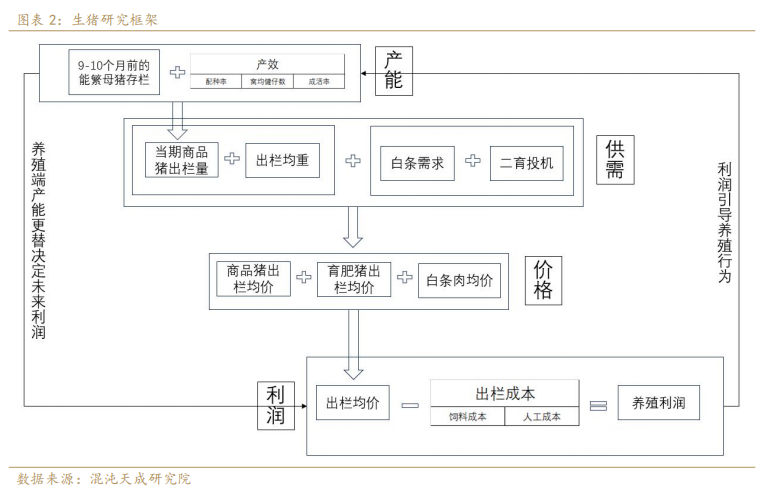 在开始周期分析前,先简单介绍一下我们的研究框架:猪周期的核心框架是当期产能决定远期利润,当期利润再反作用于当期产能的增减意愿,从而形成一个闭环。在产能增减周期,或者说是盈亏周期,其中的供应端易变量主要是均重,需求端易变量主要是二育(其实就是养殖端和投机端通过体重改变短期供应节奏),出栏均价是供需平衡后的结果,最后决定了利润。在周期更迭下现货的重心不断降低,本质上是对成本坍缩的反馈。