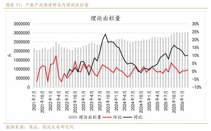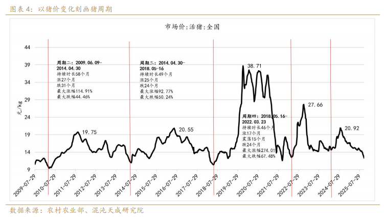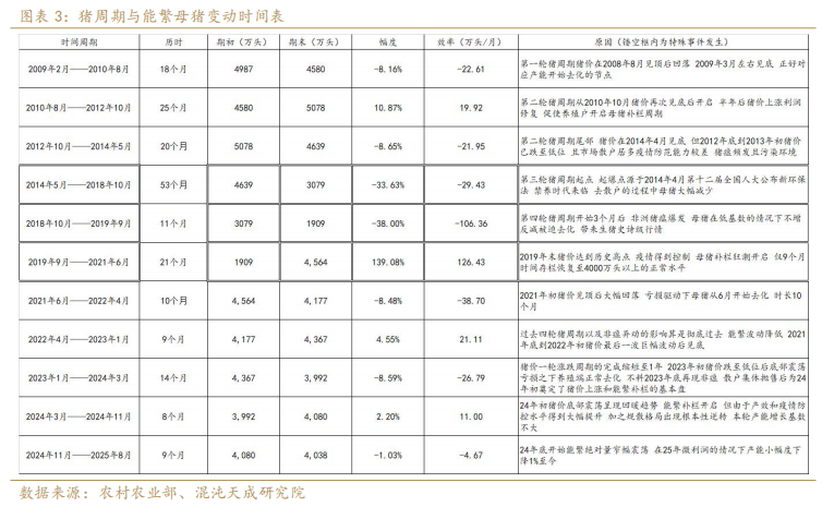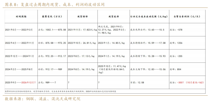 第一轮去化周期为2021年5月到2022年3月,亏损11个月,能繁存栏量下降12.68%。第一轮补栏周期为2022年4月到2022年11月,盈利6个月,能繁存栏量上升11.1% ;第二轮去化周期为2022年12月到2024年1月,亏损13个月,能繁存栏量下降6.18%。第二轮补栏周期为2024年2月到2025年8月,盈利18个月,能繁存栏量上升8.42%。