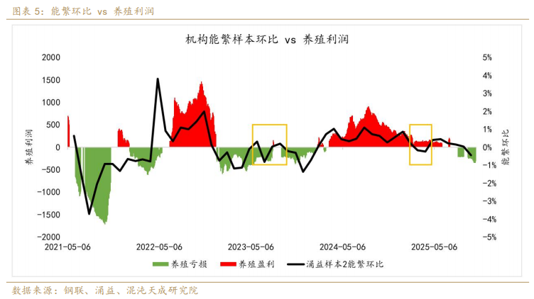 为了推导本轮去化节奏,我们将2021年后的“后非瘟”时代至今的能繁环比与利润做了对照(这里将能繁样本换成统计样本内规模场居多的机构样本,能更好的观测边际变化):