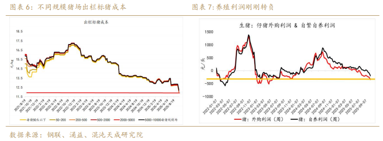 上一轮亏损去化周期时长13个月(2022年底到2024年初),亏损波谷为自繁自养利润-255元/头。本次去化周期下养殖利润转负的时间节点在今年8月,故而满打满算亏损时长至多2个月,目前亏损波谷为自繁自养利润-150元/头。