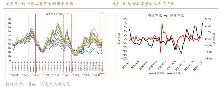 需求端:第一波金九银十带来的需求高峰已过,关注11月冬至到春节前的腌腊启动。投机需求方面,近一个月内二育栏舍利用率从低位补至高点,截流了10月出栏量的7%左右,关注腌腊需求启动节点与二育出栏节点是否匹配,也可能存在抢跑情况。