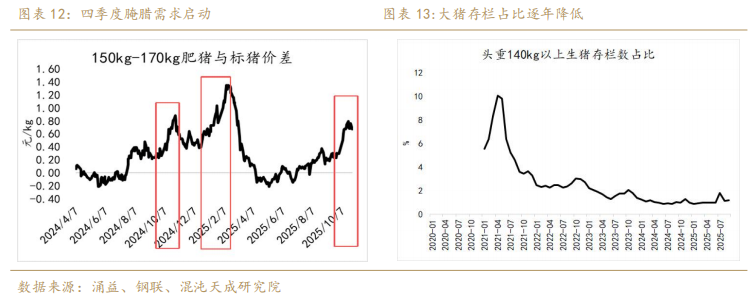 目前的情况有二:一是当下肥标差自9月中旬开始环比提升显著,到了10月中旬开始有企稳回落迹象,故而第一波需求高峰可能已经过去;二是今年的年初一在2月17号,对比去年较晚一些,需要关注11月底12月初腌腊是否有提前启动迹象,以及在该时间窗口内二育出栏表现与需求的嵌合度如何。再从大猪格局上来讲,大猪存栏占比逐年降低,但到了24年1月开始140kg以上肥猪占比震荡企稳,25年7月有一轮累重补库,9月的体重也处于高位,所以我们判断四季度中大肥的供应会偏紧,但可能不至于有明显的缺口。