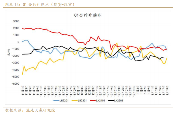 我们将01合约估值分为两个部分,一个是进入到12月附近01合约的升贴水情况,另一个是到了11月底12月初的出栏均价。首先从基差来看,11月后 01合约基本处在贴水现货1000元/吨以下的水平,除了2023年四季度猪瘟引发踩踏出栏,导致了当时近月现货暴跌后给出了不合理的01合约升水。今年预计01合约在12月能达到-700元/吨到-1000元/吨的贴水。