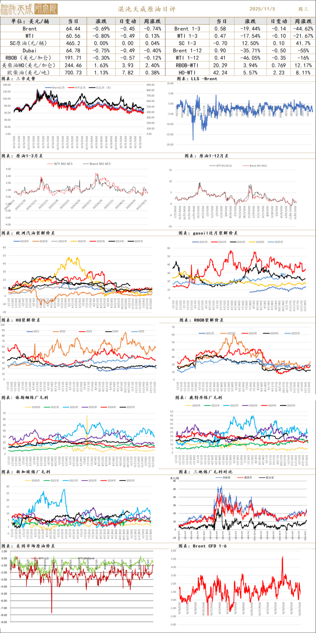 库存价差:截至10月31日,EIA原油库存上涨652万桶/日,汽油库存下降565万桶/日,馏分油库存下降246万桶/日。
