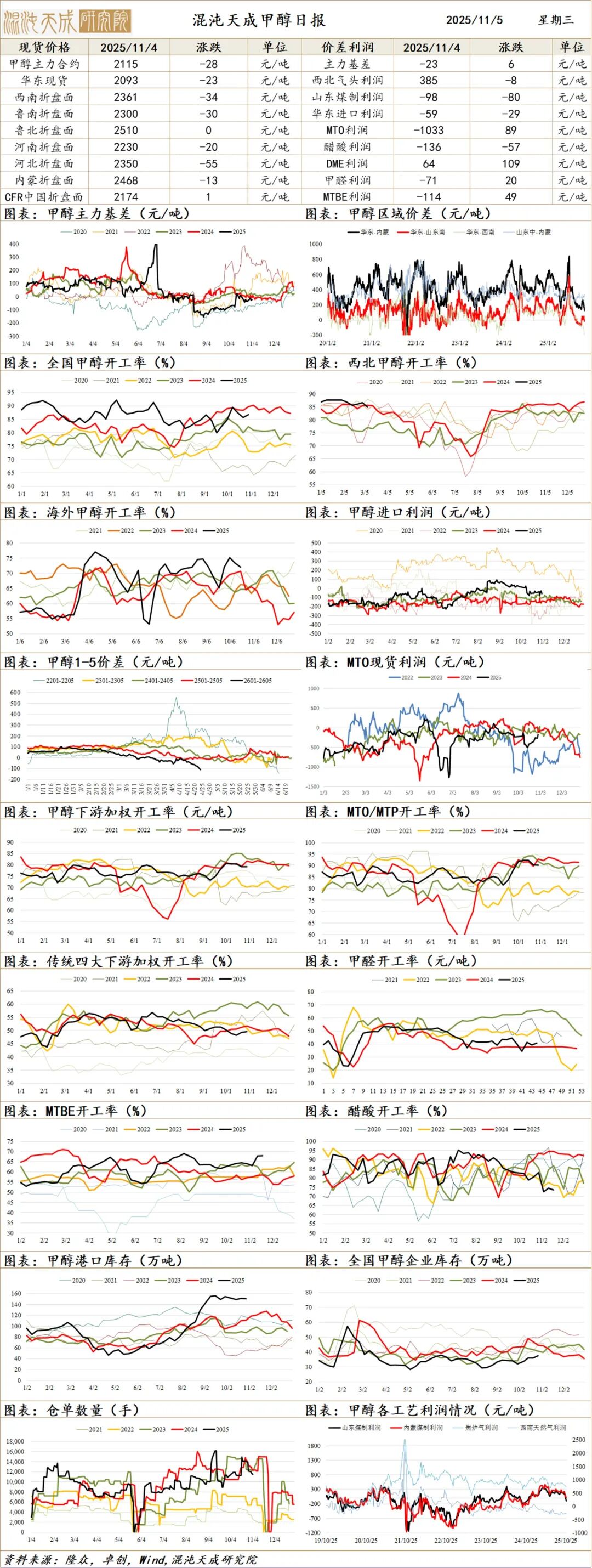 供应端:隆众数据,截止10.31日,开工微降至65.8%;利润较好开工偏高,裕龙80万吨10月投产。海外装置仍有异动,预计9-10月进口小幅缩量,后续进口小幅回升。