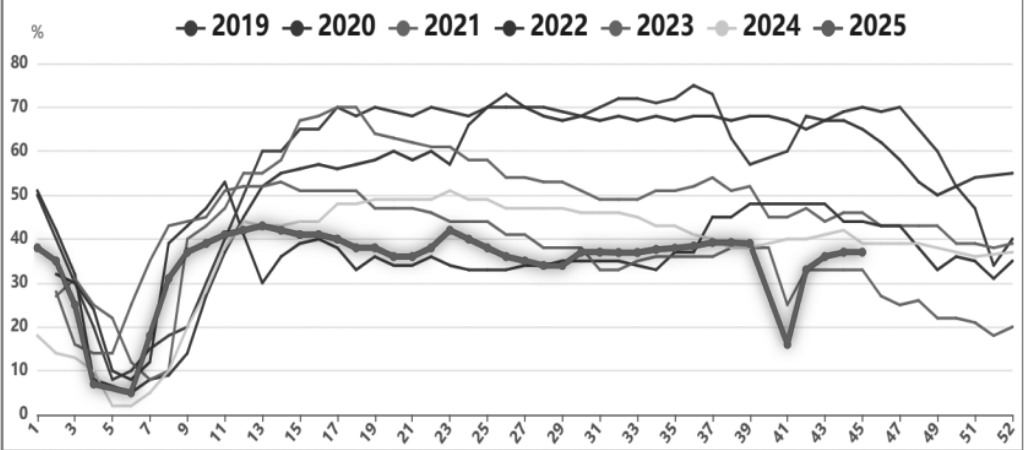 今年PVC市场出口利空接连不断。4月受“对等关税”政策影响,PVC出口一度大幅回落;8月中旬,印度提高反倾销税率,其中对我国产品税率由82~167美元/吨上调至122~232美元/吨,增幅显著,进一步加大PVC出口难度;年底印度也将落实BIS认证,只有达标企业才能出口到印度,而目前国内尚无达标企业。