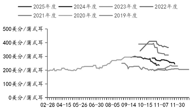 目前国内仍以采购南美旧作大豆为主。近期中美贸易关系缓和,南美大豆升贴水回落,其中,12月船期大豆升贴水由10月底的252美分/蒲式耳降至235美分/蒲式耳,巴西价格优势进一步凸显。近3个月以来,巴西大豆采购成本在3900元/吨~4050元/吨,油厂压榨亏损在70元/吨~100元/吨,高关税税率下,而美豆进口成本在4500元/吨~4600元/吨,亏损幅度更大。由此来看,压榨处于负榨利状态。后续不排除企业通过减少中短期进口、挺价、修复榨利,来促进豆粕估值上涨。