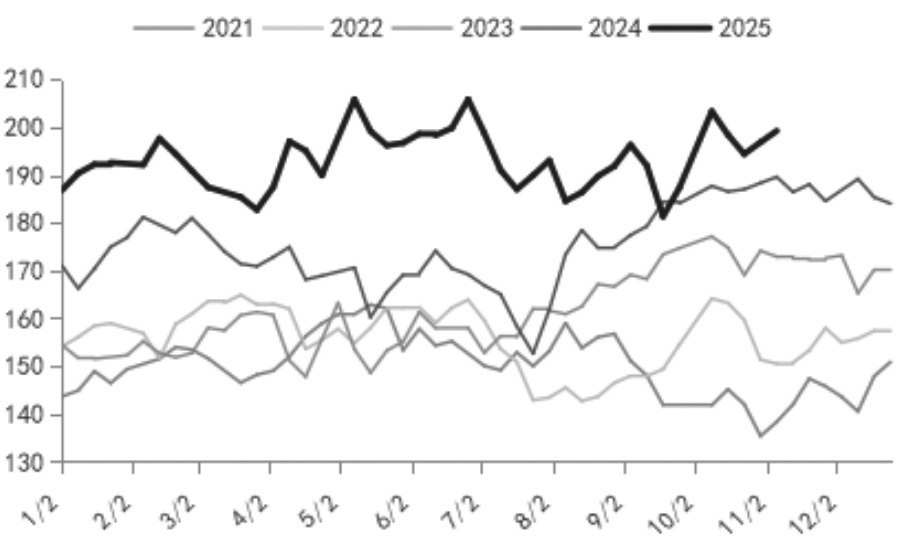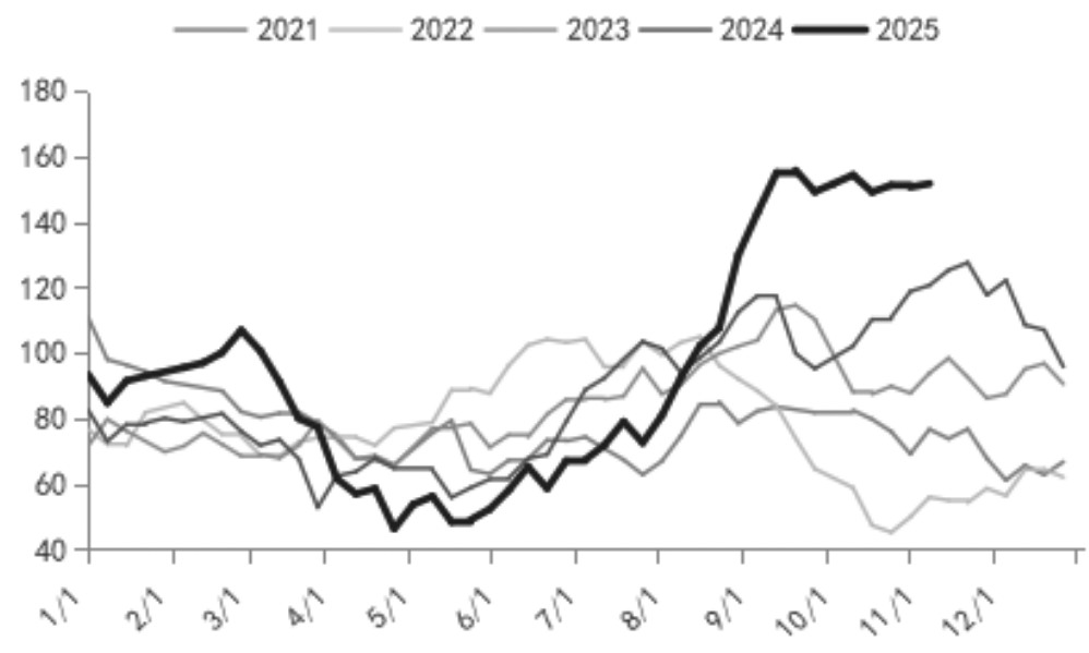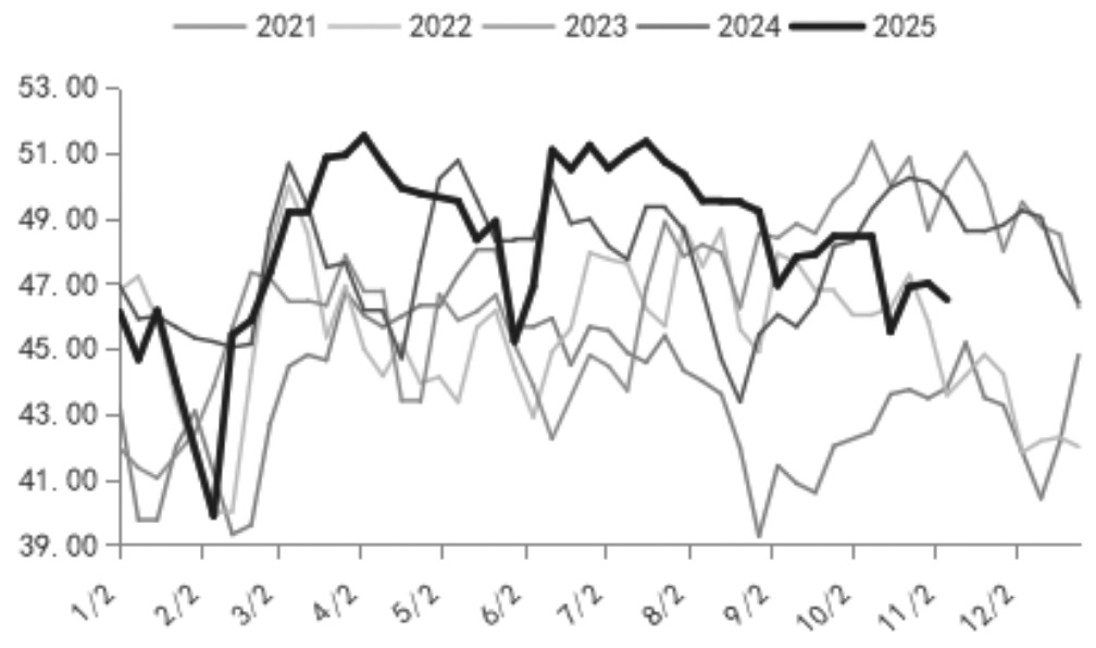 从后市预期来看,年底前港口甲醇库存仍将保持累积态势。其一,进口供应将保持充裕。考虑到当前在途货物及已装船待销售货物情况,本月中东货源到港量预计在90万吨左右。非伊货源方面,尽管马来西亚有装置检修和意外停车,俄罗斯现货报价缺乏优势,且部分中东货物转向印度市场,但南美地区到货依旧充裕,预计11月非伊货源抵港量在65万吨附近。此外,市场此前关注的伊朗限气停车预期已被证伪。根据往年常规操作,伊朗限气最早或在12月初出现,进口量明显下降的影响最早要到明年1月才能体现,短期内进口货源对港口库存的补充仍将持续。