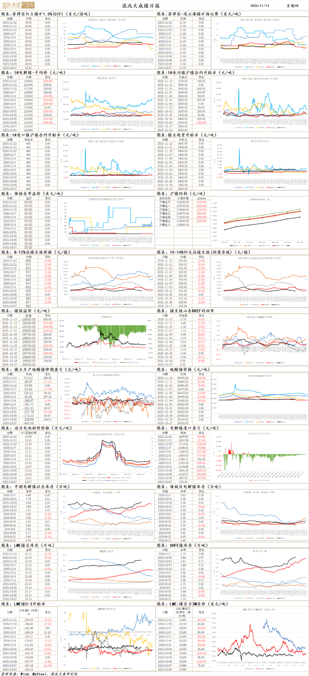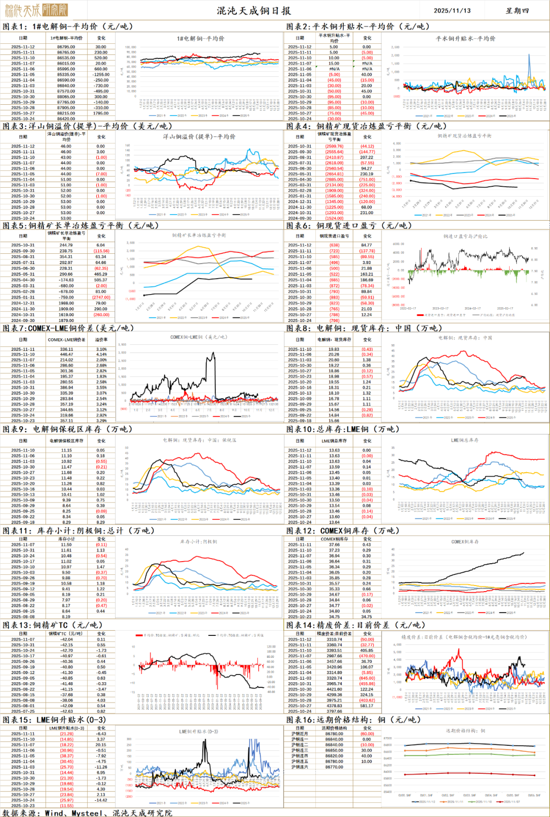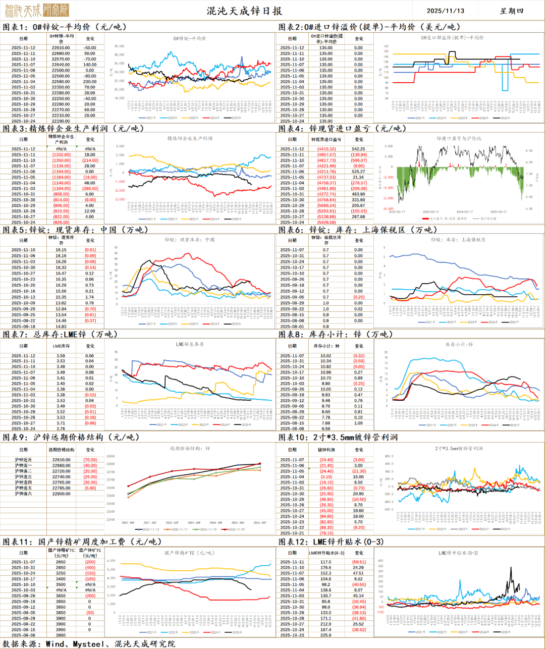 1.【CZSPT2026年一季度锌进口加工费指导环比下调】SHMET11月12日讯,据安泰科消息,11月11日,中国锌原料联合谈判(协调)小组(CZSPT)最新一期季度会议于2025年中国国际铅锌周举办同期在昆明召开,小组成员企业全数出席会议。会上,小组成员一致呼吁国内外产业链上下游应本着命运共同体的理念,着眼长远,精诚合作,一道维护全球产业的健康可持续发展。小组会议按例商议了下一阶段国内外市场加工费的预期参考区间,CZSPT也发布了2026年一季度末前进口锌精矿采购美元加工费指导价区间为105美元(平均值)-120美元(平均值)/干吨。此前2025年四季度末前进口锌精矿采购美元加工费指导价区间为120美元(平均值)-140美元(平均值)/干吨。