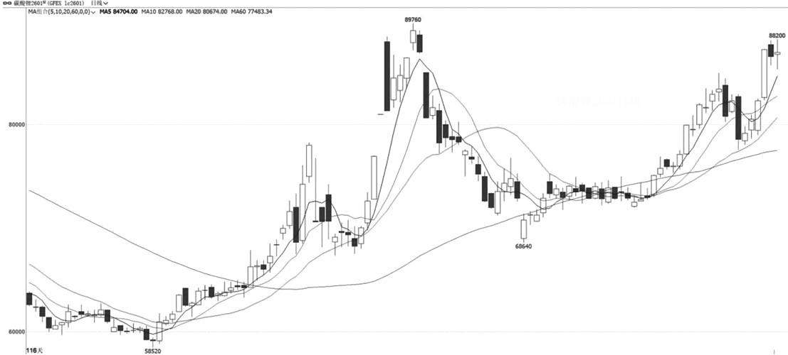 近期,碳酸锂2601合约价格回调至20日均线位置后,再度企稳走强,上方即将挑战前期高点89760元/吨。量能方面,在价格上涨过程中,成交量有所放大,持仓量同步上升。指标方面,均线系统整体走势偏强,MACD指标快慢线经历短暂调整后继续走强。综合来看,价格延续反弹,建议偏多思路对待,上方关注8月高点一线压力。