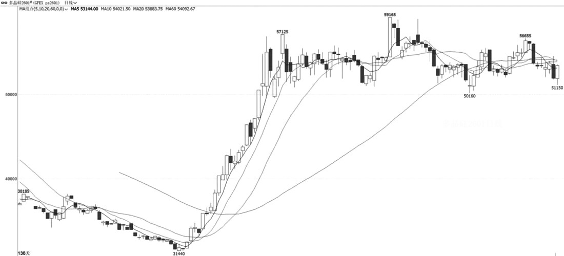 7月底以来,多晶硅2601合约价格陷入区间震荡,运行区间为50000~60000元/吨。量能方面,价格运行至区间下沿后,止跌回升,且成交量放大,持仓量回升,短期支撑较强。指标方面,均线系统整体处于水平走势,MACD指标快慢线围绕零轴整理。综合来看,价格维持区间整理,建议耐心等待价格的突破。(中原期货 刘培洋)