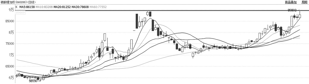 昨日,碳酸锂加权价格盘中创出新高,但长上影线说明多空双方在前高附近存在一定分歧,价格暂未有效向上突破。均线系统维持多头排列,K线在所有均线上方,市场处于多头趋势之中。MACD在零轴上方保持红柱,DIFF和DEA两线向上运行,多头势能有望延续。量仓方面,10月中下旬以来的波段上涨过程伴随成交量和持仓量的稳步增长,说明多头力量增强。综合来看,碳酸锂处于多头主导之中,上升趋势良好,未来突破前高的概率较大。