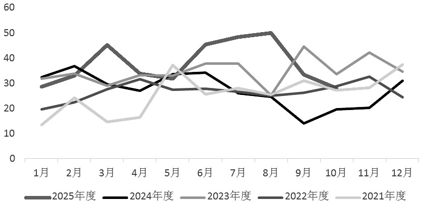 此外,随着10月产量见顶,市场对年内马来西亚棕榈油产量也作出相应预估。部分马来西亚贸易及行业官员表示,2025年该国毛棕榈油产量预计同比增长3.4%,达到创纪录的2000万吨。截至10月,马来西亚1—10月累计产量为1652万吨。若全年产量目标为2000万吨,则11—12月仍需产出348万吨。尽管接下来将进入传统季节性减产周期,但这两个月的产量水平仍可能高于五年均值。