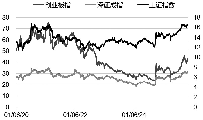 A股当前的矛盾是成交过于集中。尽管11月A股成交集中度指标徘徊于40%附近,低于45%的历史偏高经验值,但明显高于35%的历史底部经验值。在结构风险仍待释放的背景下,指数在前高附近踌躇不前,当前动能从科技板块向顺周期板块切换有利于释放成交集中的风险。回顾2015年A股大涨前的震荡期,成交集中度先升后降,表征资金从传统热门行业转向新行业时,资金结构趋于健康,从而为后期大涨奠定基础。近期成交集中度不断下降至50%以下,成交额靠前个股表现均偏弱,反映资金从拥挤的科技板块向其他板块切换,这有利于平衡市场的资金结构。若后续缺乏数据支撑,市场或将延续 “结构风险释放—主线逻辑推动反弹—结构风险加剧—风险再度释放”的震荡格局。