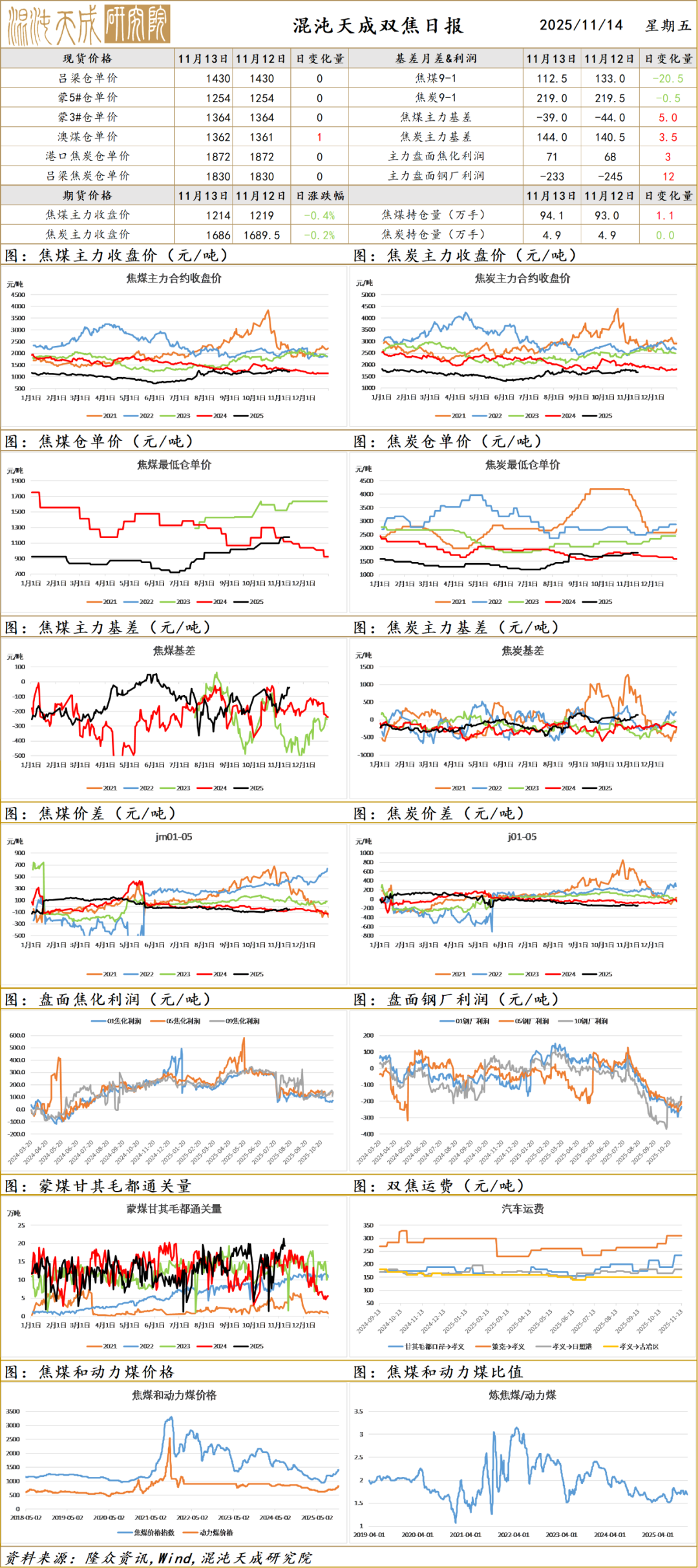 2.中国煤炭资源网冶金部11月13日重点关注:焦炭市场延续偏强格局,虽近日期货盘面大幅走低,市场情绪略有转弱,外加高炉冬修以及亏损、环保等因素检修增多,铁水明显下滑,刚需回落。但供应端焦化同样受到环保、亏损多有不同程度减产,供需同步收紧,产地炼焦煤市场表现强劲,加之南北方钢厂均受外部因素扰动影响到货,场内焦炭库存表现为中等库存水平,短期看焦炭有望落地,后期关注铁水以及原料煤表现。焦煤方面,目前仍有部分煤矿因工作面搬迁、检查等因素生产受限,产地供应恢复缓慢,短期偏紧格局难以改善。需求端,期货盘面持续下跌,叠加多数焦企补库到位,放缓原料采购,市场情绪有所降温,但基于个别低库存焦企仍有一定采购需求,且多数煤矿暂无库存压力,煤价仍有一定支撑,短期高位震荡为主。进口蒙煤方面,由于盘面下跌明显,下游接货持续压价,口岸价格承压下调,目前蒙5原煤成交已降至1100元/吨左右,蒙3精煤成交价格降至1210元/吨左右。