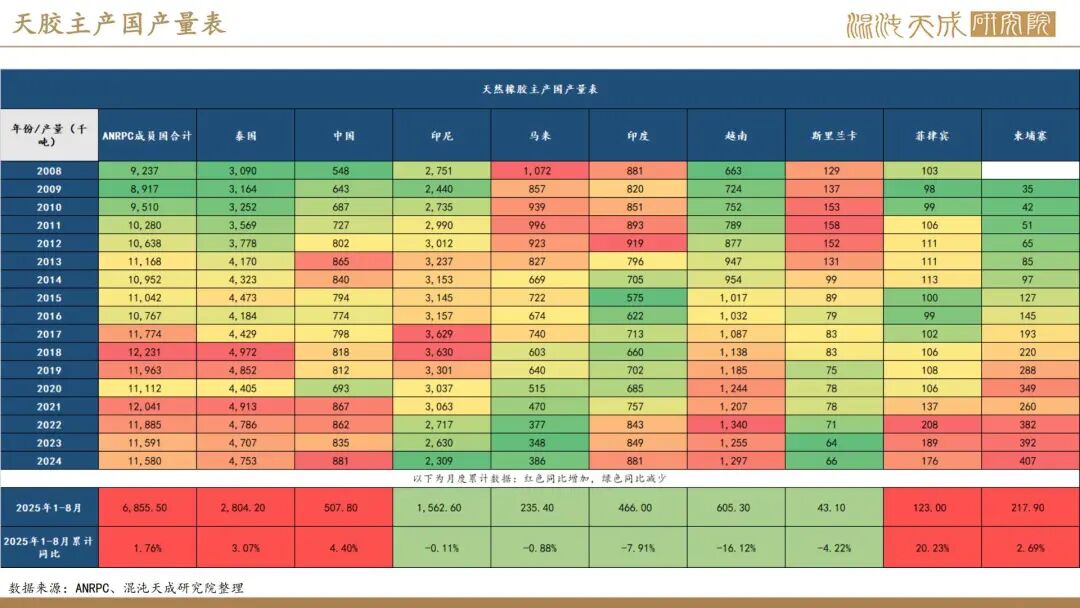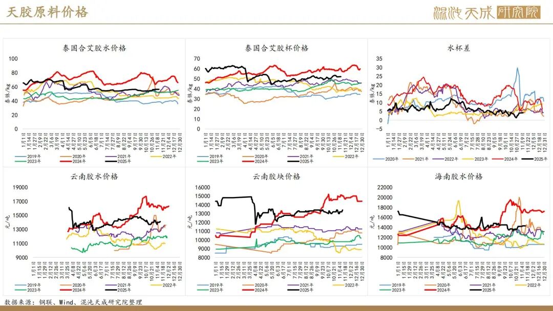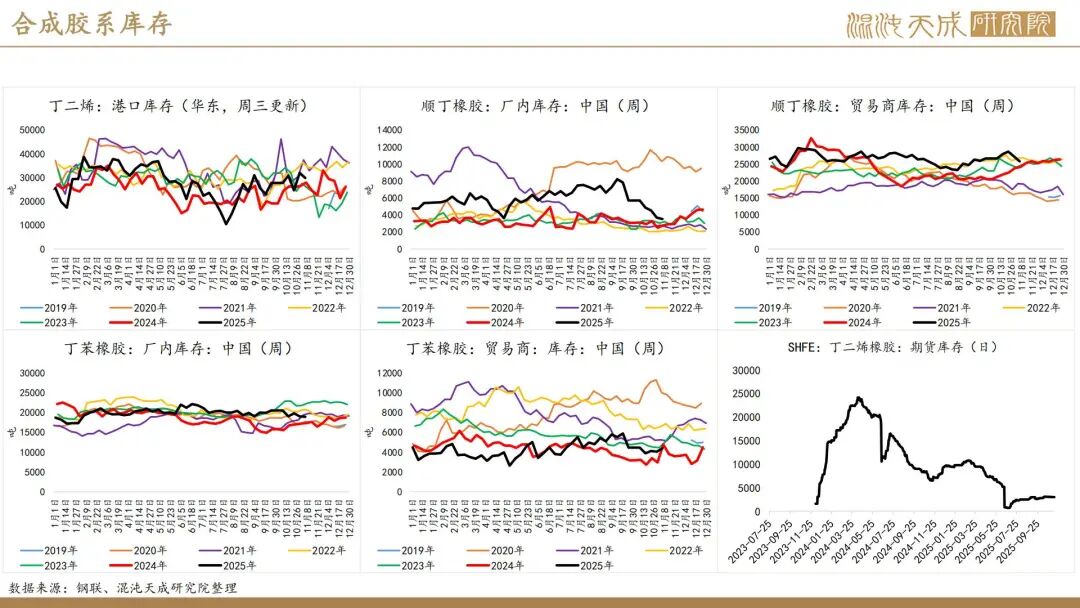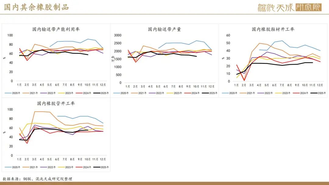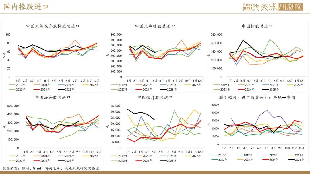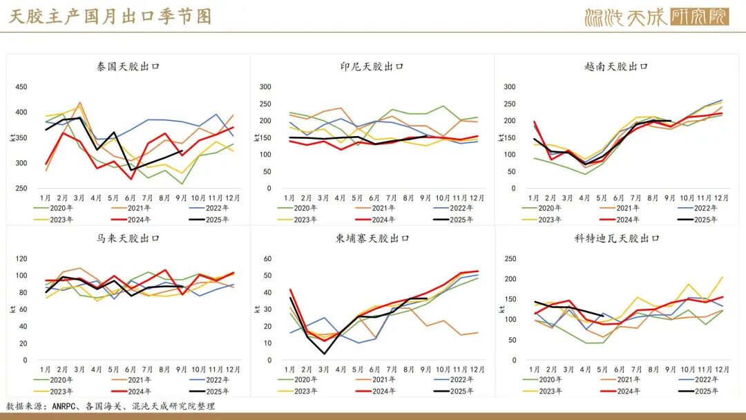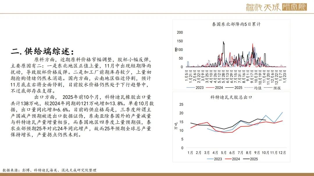出口方面, 2025年前10个月,科特迪瓦橡胶出口量共计138万吨,较2024年同期的121万吨增加13.8%。单看10月数据,出口量同比增加6.6%。目前的供应格局是,三季度所谓主产国减产预期被进出口数据证伪,东南亚除泰国外的产量减量与科特迪瓦产量增量相当,而泰国地区四季度上量预期强,泰农业部预期25年对比24年同比增产,故而25年预期全球总产量保持增长,产量拐点仍然未到。
