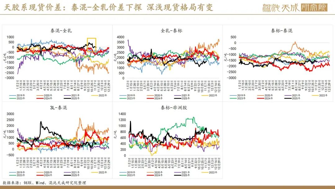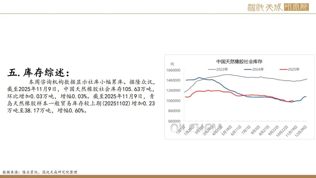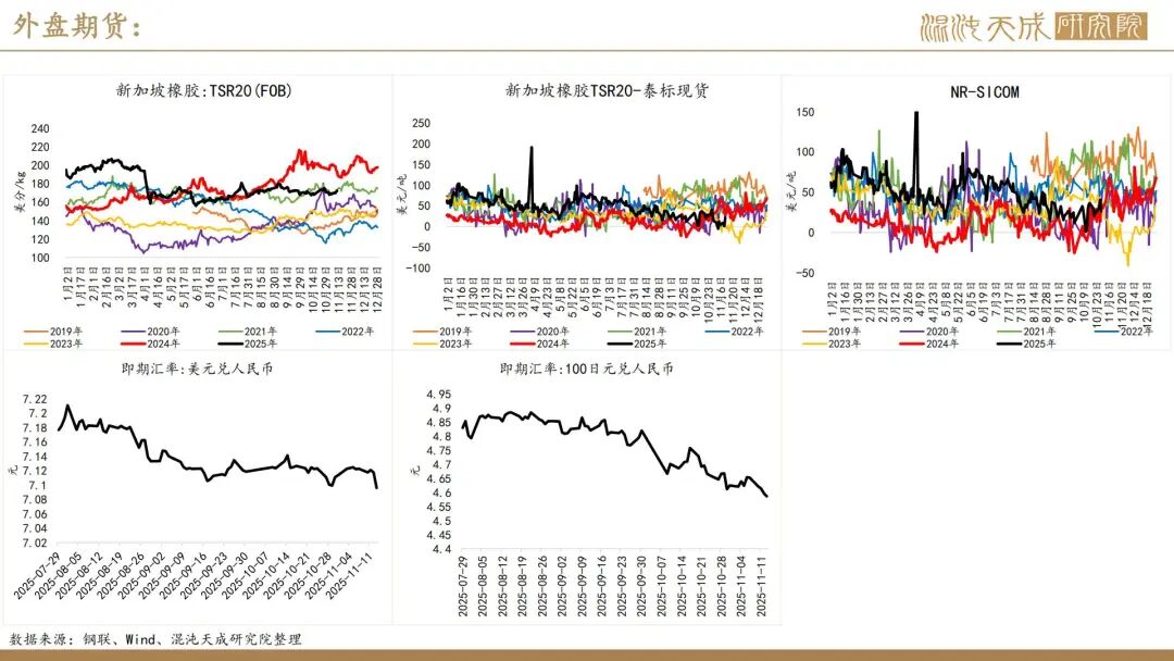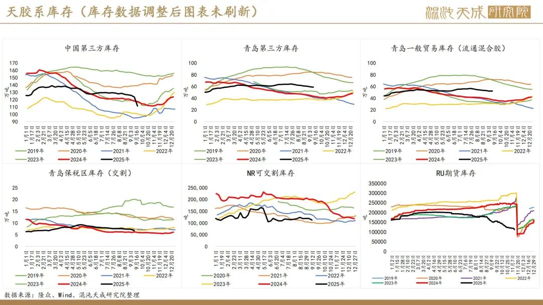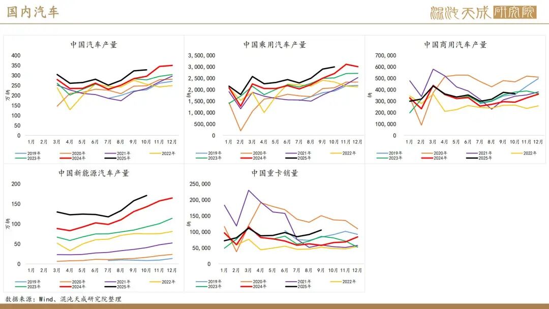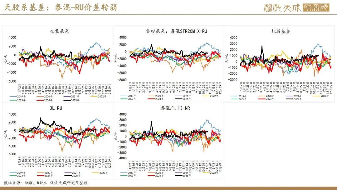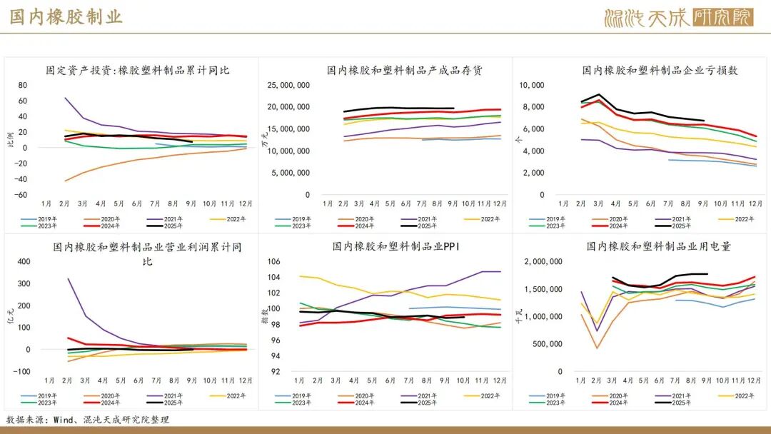 出口方面, 2025年前10个月,科特迪瓦橡胶出口量共计138万吨,较2024年同期的121万吨增加13.8%。单看10月数据,出口量同比增加6.6%。目前的供应格局是,三季度所谓主产国减产预期被进出口数据证伪,东南亚除泰国外的产量减量与科特迪瓦产量增量相当,而泰国地区四季度上量预期强,泰农业部预期25年对比24年同比增产,故而25年预期全球总产量保持增长,产量拐点仍然未到。