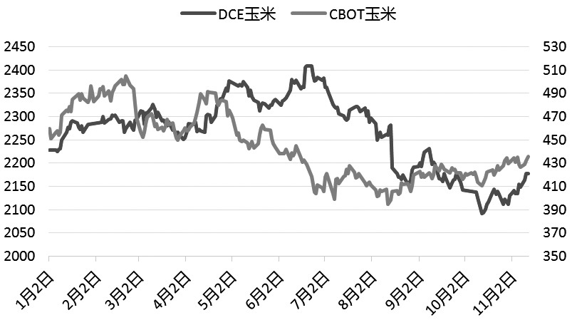 自10月底以来,国内原本是玉米集中上市的阶段,但是北方主产区以及南方销区玉米逐步开启了反弹行情。截至11月14日,辽宁锦州港国标二等玉米报价2205元/吨,较10月31日上涨75元/吨;广东蛇口港国标二等玉米报价2330元/吨,较10月31日上涨100元/吨。