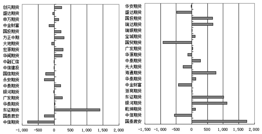 空头前20席位中,增持空单的有13家。其中,增持空单数量超过1000手的有3家,分别为国泰君安期货席位、银河期货席位和东证期货席位,分别大幅增加1758手、1122手和1022手。另外,增持空单数量介于100手至1000手之间的有7家,分别为乾坤期货席位、华泰期货席位、海通期货席位、中泰期货席位、宝城期货席位、瑞达期货席位和国投期货席位,分别增加121手、128手、776手、279手、105手、674手和670手。剩余3家增持不足100手。