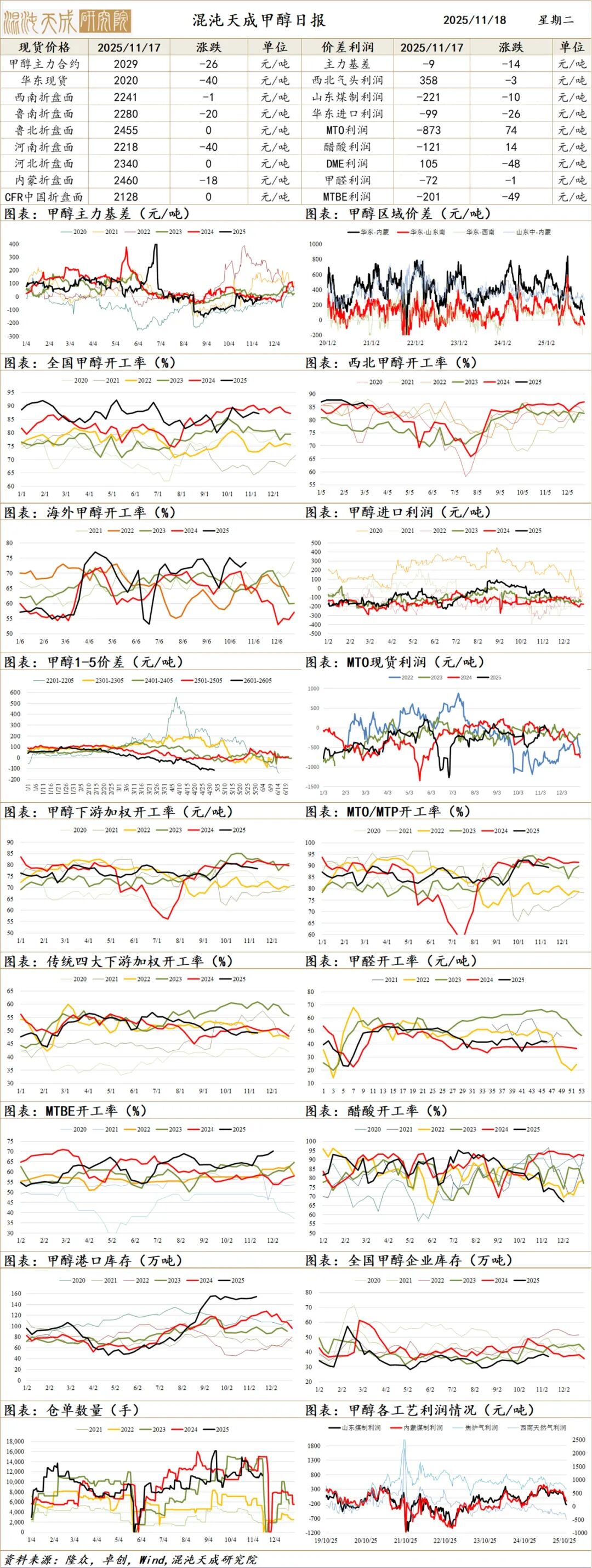 供给:国内开工回升,关注气温骤降后气头停车情况。海外开工仍在高位,目前预计至12月进口不受影响,关注伊朗限气停车情况(传因制裁,伊朗把甲醇当其国内经济支柱,冬季不再大面积限气,只会轮检,往年冬季11月底12月开始陆续检修)。反内卷对甲醇真实影响暂不大,主要受煤支撑。