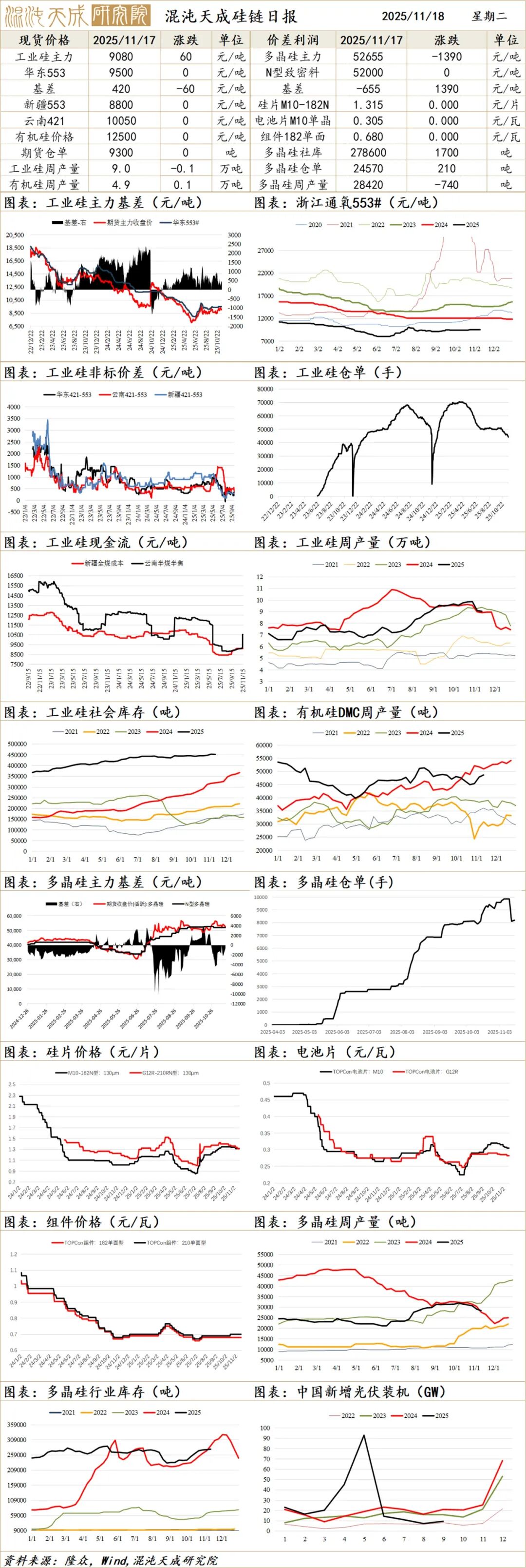 1、反内卷实际影响不大,核心供需预计边际改善,但仍累库。11月供需双弱,西南兑现减产,枯水期边际改善累库收窄。本周传北方环保、西南能耗,均为例行情况,预计实际影响不大。需求端有机硅有限产提价预期,目前了解减产30%是较产能,实际减产要低于此幅度。