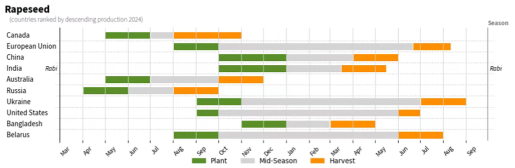 今年的弱拉尼娜现象预计持续至明年2月,当前加拿大、俄罗斯、澳洲菜籽已收获完毕,乌克兰及欧盟菜籽处于生长期。