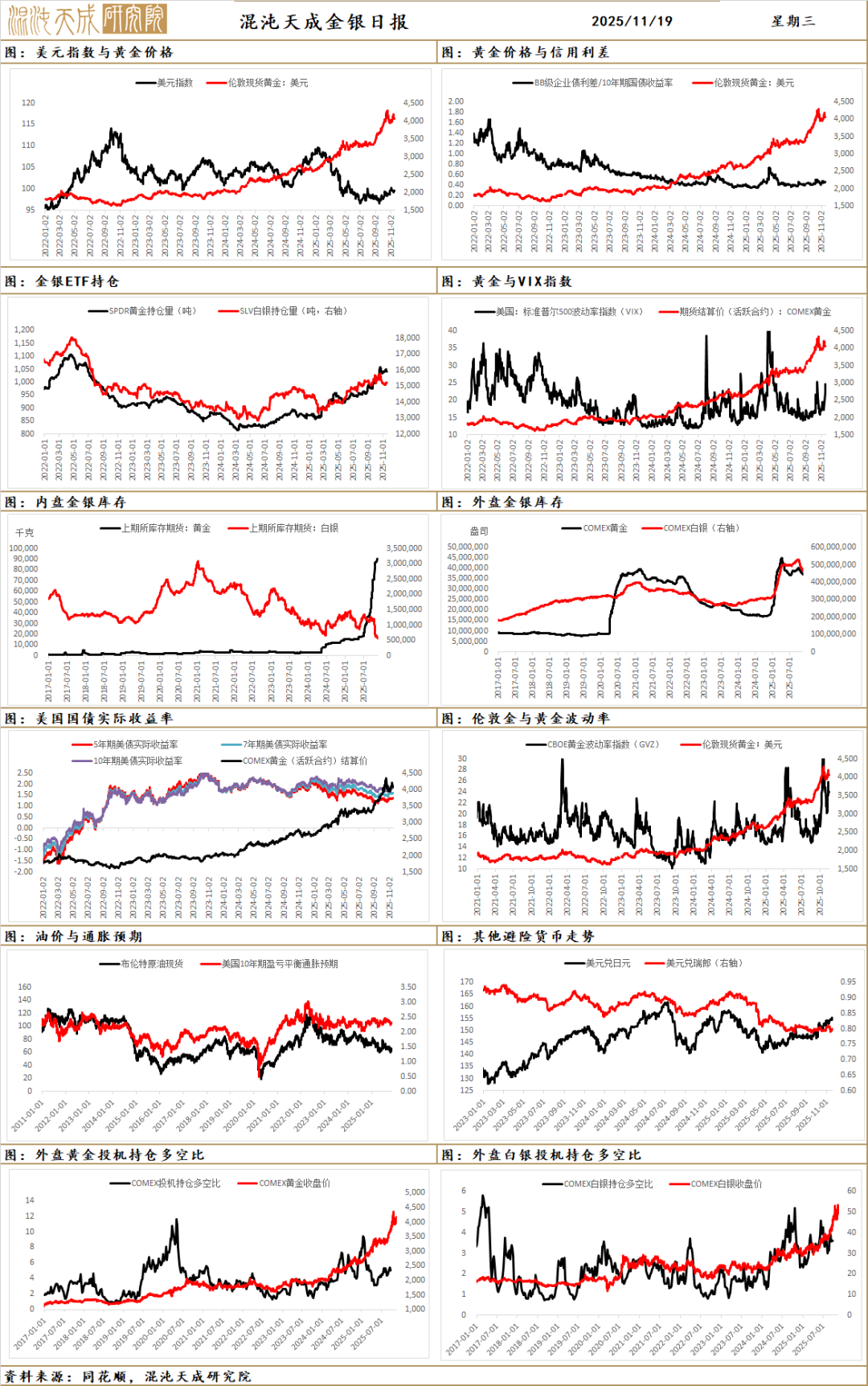 亚马逊正计划通过公司债市场筹集约120亿美元,这是这家科技巨头近三年来首次发行以美元计价的债券。上个月,Meta宣布计划进行高达300亿美元的最大规模债券发行;云基础设施和软件公司甲骨文(Oracle)也计划通过债券市场筹集150亿美元。AI企业融资潮来袭,近期的CDs上行也基于此,这一定程度上驱动利率上行,同时也形成市场风险,科技股在英伟达财报公布前相对谨慎。在前日定价流动性风险形成贵金属与美股的同步回落后,昨日贵金属和美股出现分化走势,贵金属未伴随美股的回落走低,原因可能源于对于“衰退风险”的定价,而非“流动性风险”。