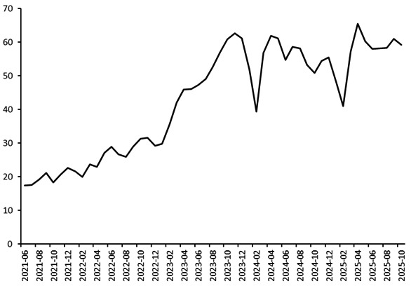 海外白银投资需求的旺盛是白银现货紧俏的重要原因,在美联储宽松货币政策预期的驱动下,国际银价今年以来表现强势。2025年1月2日至11月14日,COMEX白银主力合约价格涨幅高达71.95%。相关数据显示,海外主要白银ETF持仓总规模由今年2月6日的24957吨上升至11月14日的27971吨,增持幅度达到12%。其中,规模最大的iShares Silver Trust持仓总规模同期由13333吨上升至15218吨。值得注意的是,海外白银ETF主要以白银实物进行担保。截至10月,全球最大的LBMA白银库存量为26255吨,其显著低于海外主要白银ETF的总持仓量,两者差值超过上千吨。考虑到白银ETF所持现货大部分都存放于伦敦金银市场,伦敦白银的可用库存十分有限。