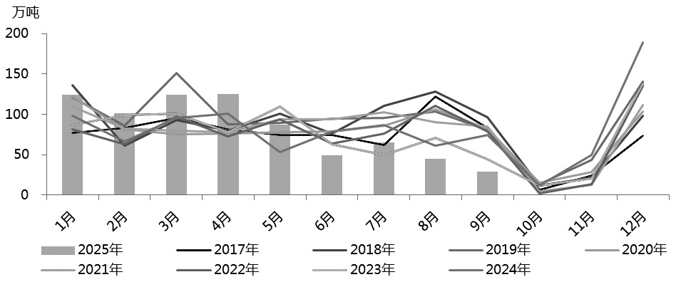 截至9月底,2024/2025榨季全国共生产食糖1116.21万吨,同比增加119.89万吨,增幅为12.03%。2024/2025榨季结转库存为68.2万吨,同比增加32.4万吨,增幅为90.93%。广西9月仅销售26.6万吨,同比下降近20万吨;产销率为93.16%,同比下降2.45个百分点。9月市场销售速度明显放缓,广西市场现货信用风险提升以及外盘价格快速下行,让贸易商情绪普遍悲观。2024/2025榨季末端以累库告终,市场此前预计的“榨季末翘尾”变成了“榨季末下行”。
