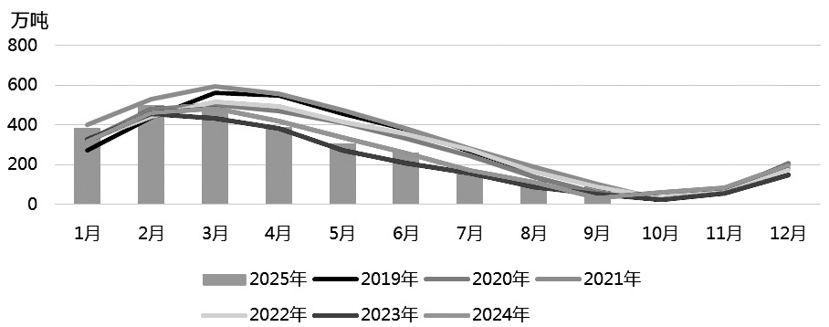 榨季末期的丰产延续,带来超出市场预期的高出口量,预计巴西中南部地区10—12月食糖出口量将高于去年同期。巴西10月出口糖和糖蜜420.49万吨,较2024年10月的372.94万吨增加47.55万吨,增幅为12.75%,单月出口量创下历史新高;日均出口量为19.11万吨,较2024年10月的16.95万吨增加2.16万吨。2025年1—10月,巴西累计出口食糖2764万吨,整体仍处于高位;中国累计进口巴西食糖400万吨。在增产周期下,预计巴西出口延续高增长态势。