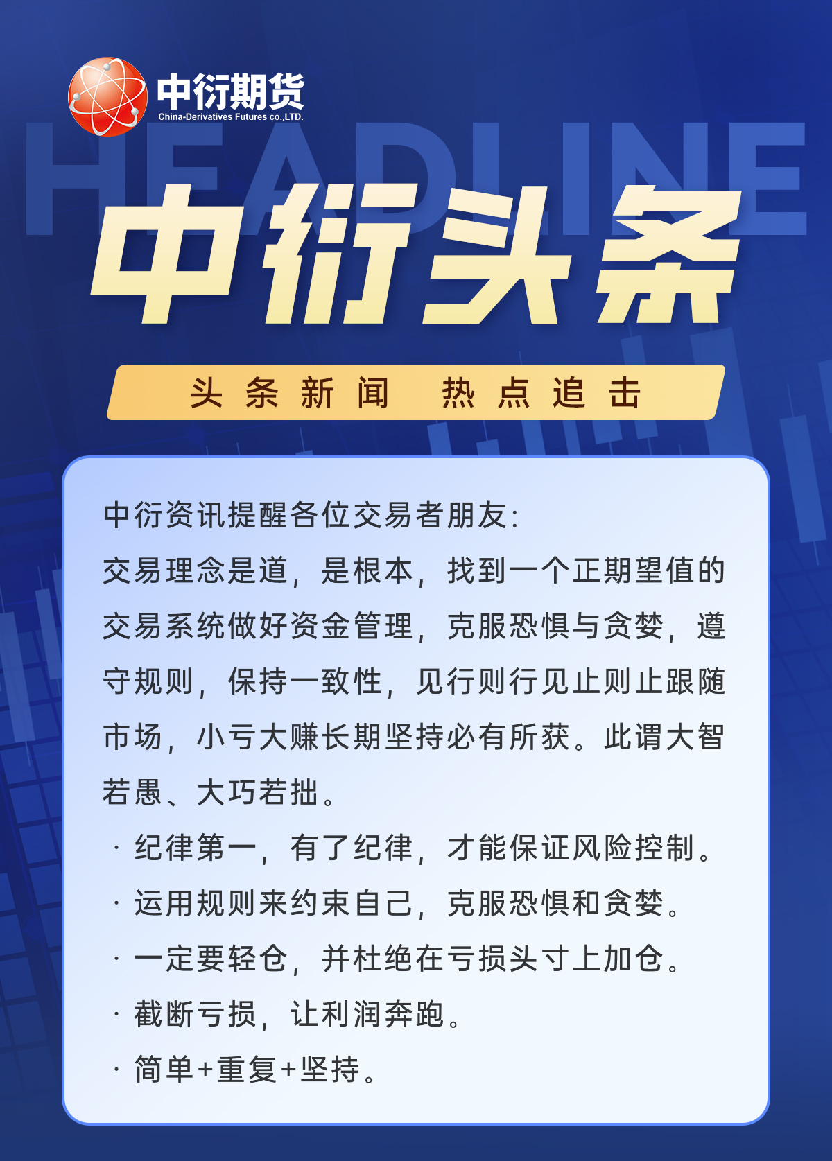 中衍期货有限公司具有中国证监会核准的期货投资咨询业务资格(批文号:证监许可[2012]1525号)。本公司文件/图片/视频的观点和信息仅供中衍期货风险承受能力合适的签约客户参考。本文件/图片/视频难以设置访问权限,若给您造成不便,敬请谅解。本公司不会因为关注、收到或阅读本文件/图片/视频内容而视其为客户;本文件/图片/视频不构成具体业务或产品的推介,亦不应被视为相应期货和衍生品的交易建议,不应凭借本文件/图片/视频进行具体操作。请您根据自身的风险承受能力自行做出交易决定并自主承担交易风险。