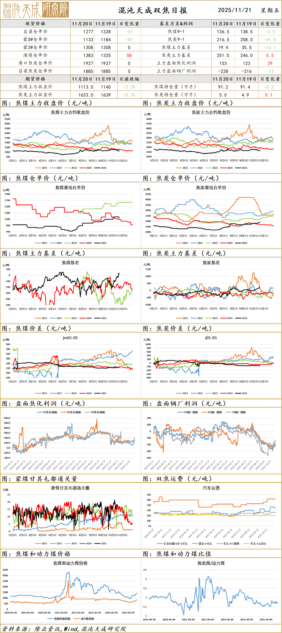 2.中国煤炭资源网冶金部11月20日重点关注:焦炭市场延续偏强运行,不过随着期货盘面市场情绪略有走弱。钢厂高炉开工中位偏高,钢厂到货略有分化,部分钢厂到货略有改善,有适当的控制到货现象,部分钢厂库存延续中等偏低,供应端随着盈利能力改善以及河南、河北环保结束,供应略有回升,整体看短期焦炭基本面边际改善,后期关注原料煤的回落幅度以及铁水表现。焦煤方面,产地供应扰动仍存,产量整体恢复缓慢,但终端淡季需求走弱,叠加蒙煤通关高位,原料供应边际转好,双焦市场情绪继续走弱,目前下游多暂缓采购原料,煤矿新签订单承压,近两日山西地区骨架煤种价格陆续下跌30-50元/吨,煤矿签订情况一般,市场降价范围逐步扩大。进口蒙煤方面,期货盘面持续下跌,市场信心较差,贸易商报价偏弱维持,但下游依旧谨慎观望,口岸整体成交清淡,蒙5原煤价格弱稳于1050-1060元/吨左右。