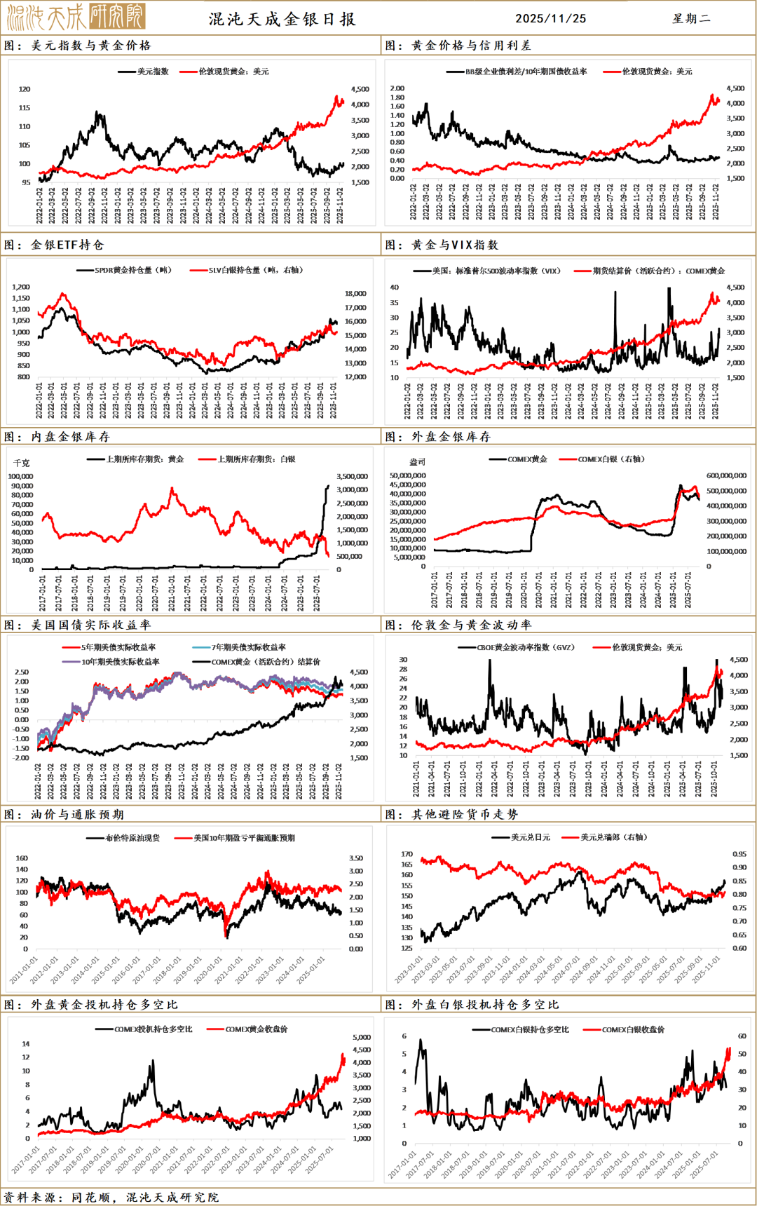 美联储再次出声放鸽:美联储理事沃勒表示,最新数据显示劳动力市场依然疲软,主张在12月进行降息;旧金山联储主席戴利表示,她支持在下个月降息,因为她认为就业市场突然恶化的可能性比通胀骤然上升更大,也更难以控制。 继前期鹰派表态主导市场后,两位鸽派官员的言论对于市场尤为关键,市场高度依赖美联储的预期,在缺乏经济数据的指引下,其表态成为市场是否存在经济托底的重要因素。市场降息预期持续回升至80%,这也显著推动贵金属走势。