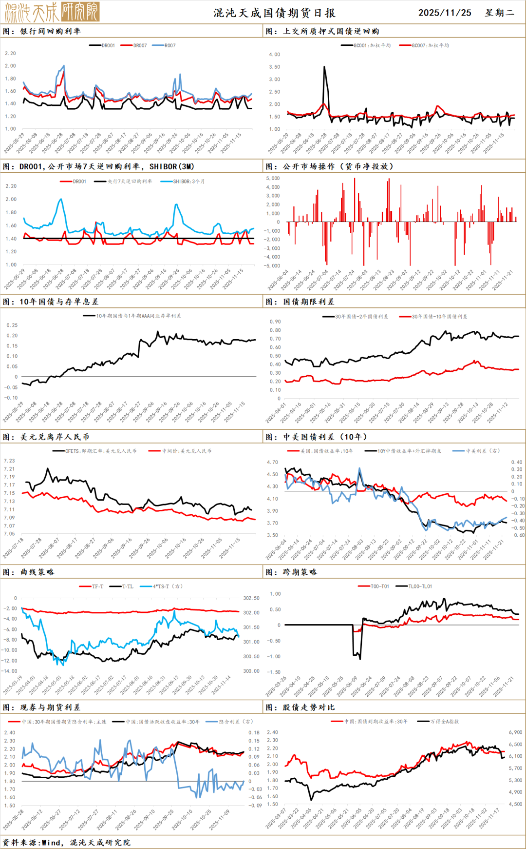 通缩压力是国债的中长期驱动,需持续关注货币、财政政策的协同发力,以及产业结构性改革进展。当前市场的核心宏观锚点在于央行通过买断式逆回购、国债买卖及MLF加量续作释放的“稳货币”信号。这一系列操作明确了政策呵护流动性的意图,但也暗示了对利率下行节奏的调控,1.75%-1.85%仍是长端的重要心理区间。未来的关键变量在于12月中央经济工作会议的定调及基金赎回新规的最终落地。虽然基本面偏弱和政策托底明确,但年内货币政策偏保守,政策利率维持1.40%,市场成交量清淡,经历修复行情后债市赔率降低,维持震荡看法,建议逢低布多。