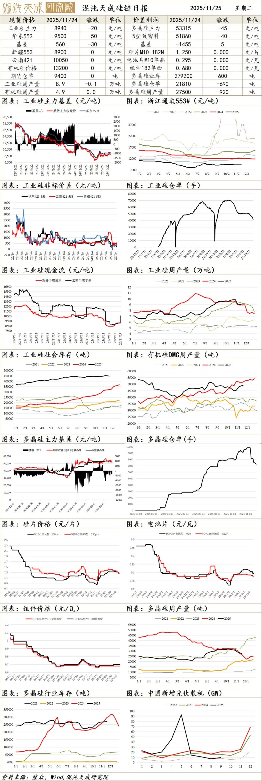 1、反内卷实际影响不大,核心供需边际改善,但仍累库。11月供需双弱,西南兑现减产,合盛恢复至八成开工,据传暂不会继续提升。需求端有机硅行业反内卷已达成一致,有限产提价预期,多晶硅产量在小幅下降。