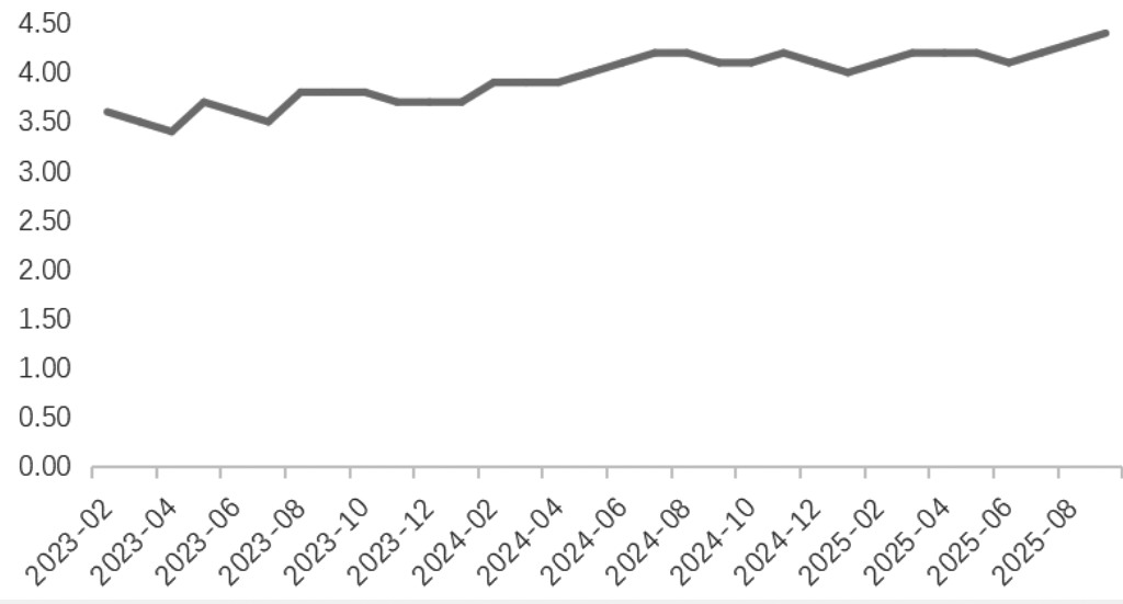 第三,数据暂停发布使得就业担忧暂缓。前期美国政府“停摆”导致多项核心经济数据暂停发布,市场对就业情况的短期担忧逐步缓解。另外,前期公布的美国ADP就业数据边际改善且超市场预期,一定程度上减轻了市场对美国经济衰退的担忧,为美元指数提供支撑。随着美国政府恢复运作,相关经济数据逐步发布。最新公布的美国9月就业数据呈现明显矛盾特征:9月新增非农就业人口录得11.9万,大幅超出市场预期,但前两个月数据合计下修3.3万;失业率意外攀升至4.4%,创4年新高。市场对这一矛盾数据反应平淡,美元指数短暂下跌后迅速收复跌幅,表明投资者倾向于等待后续数据进一步验证。此外,9月数据仅反映前期就业状况,美国就业市场真实景气度仍需11月非农数据验证,而该关键数据已推迟至12月16日发布,短期市场对就业情况的担忧缓解。