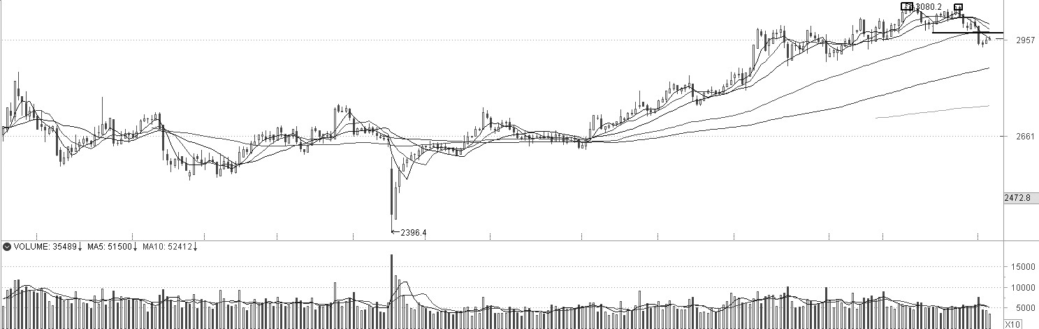 IH加权在日线级别形成小双头后,上周五跌破颈线。按照颈线目标测算,下方支撑在2880点。均线方面,MA5、MA10、MA20均拐头向下,且MA5为短期移动压力线,后续或向下测试MA120的支撑情况,其是双头形态的目标位。指标方面,MACD绿柱收窄,但DIF率先跌破零轴,DEA紧随其后,表明IH加权指标走弱。综合分析,IH加权自10月27日达到年内最高点后上涨乏力,短期料向下寻求支撑。