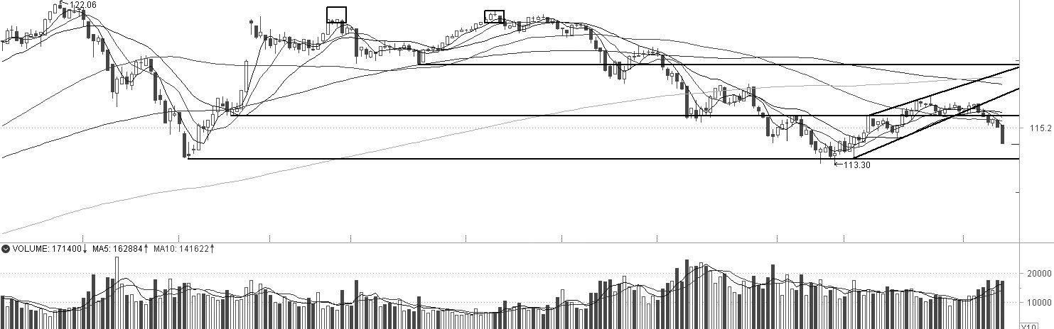TL加权上周跌出上升通道,宣告自9月30日的反弹告一段落。11月26日,收出一根光头中阴线,短期存在加速下跌迹象。均线方面,MA5、MA10、MA20再度拐头向下。指标方面,MACD绿柱扩大,DIF已经跌破零轴,DEA距离零轴一步之遥。综合分析,TL加权已经改变通道运行节奏,后续将测试113.3点的支撑有效性。(招商期货 于虎山)