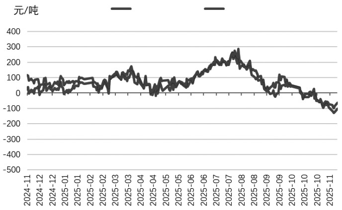 螺纹钢长、短流程均有一定幅度亏损,成本支撑显现。电炉方面,由于螺纹钢价格表现不佳,叠加成本端废钢价格相对坚挺,电炉利润整体呈现震荡下行之势。9月底以来,电炉利润又开启一轮下跌走势,并不断刷新年内低点。11月中旬起,随着螺纹钢价格止跌反弹,电炉生产利润有所回暖,但并未摆脱整体亏损的境地。截至11月24日,全国电炉平均生产利润为-100元/吨,华东地区平电生产利润为-169元/吨,华东地区谷电生产利润为-48元/吨。高炉方面,螺纹钢长流程利润上半年维持小幅盈利,并随着国内“反内卷”预期升温,在7月底到达年内顶点,之后便持续下滑。截至11月24日,据粗略估算,螺纹钢长流程生产利润为-64元/吨,接近年内最低水平。当前长流程螺纹钢的亏损幅度虽不至于引发钢厂大规模减产,但持续亏损状态将限制价格下跌空间,对价格形成一定支撑。